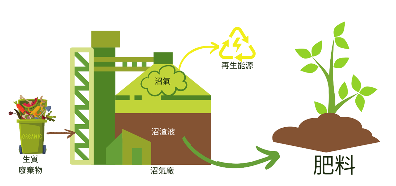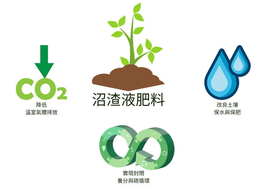 生質廢棄物中富含難以透過生物降解轉化為沼氣的腐植質(黑褐色之土壤有機質,有助於土壤保水與保肥)以及植物營養素,這些副產物可以作為有機肥料應用於農業中,為環境帶來土壤改良、降低溫室氣體排放,以及實踐循環經濟等效益。