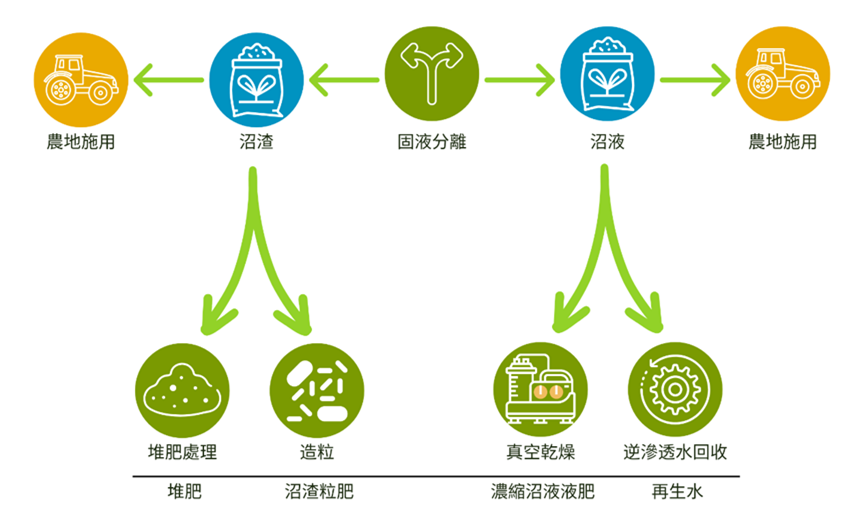 沼渣液不需經過處理就是優質的肥料可以直接施用於農地中,當然也可以再進一步處理加工成為更方便施用的型式,如粒狀肥料或濃縮液肥。